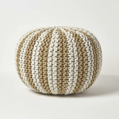 HOMESCAPES Large Off White and Linen Knitted Pouffe 100% Cotton Round Bean Filled Striped Footstool 50 x 40 cm