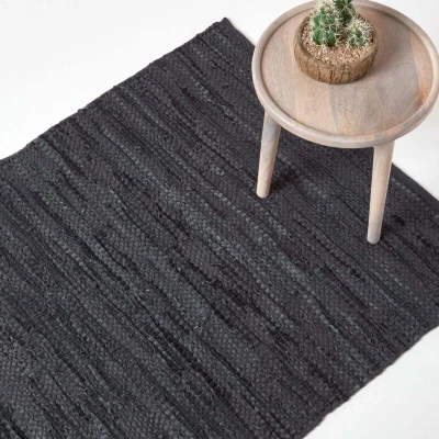 Brand Homescapes Size Available 150cm x 240cm (59" x 94") Colour Black Material 100% Leather Care Instructions Spot clean only Pack Includes One rug Pattern Plain Denver Leather Woven Rug comes out as a beautiful and sturdy rug with interwoven leather cuts on traditional handlooms. This handmade, heavy weight rug is of excellent quality and performs very well especially on hard floors and looks great despite heavy traffic. It imparts a rich look to the entire setting. These rugs coordinate well with other leather upholstery.