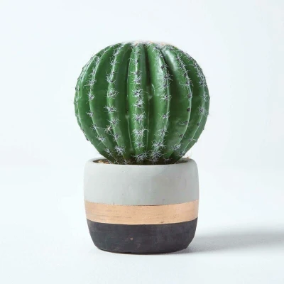 General description This HOMESCAPES Golden Barrel Artificial Cactus is a stylish addition to any space, measuring 19 cm tall. Perfect for decorating office desks, side tables, and coffee tables, it introduces a modern desert style into your home or office. Technical specifications Brand: Homescapes Plant Height: H 19 cm x W 13 cm Pot Dimensions: H 9 cm x W 11 cm Pot Base: 10 cm Colour: Green Material: Plant - polyfoam & plastic; Pot - cement Other information Care Instructions: Wipe clean with a soft cloth This cactus plant has been UV treated for lasting color; it is recommended to keep it out of direct sunlight.