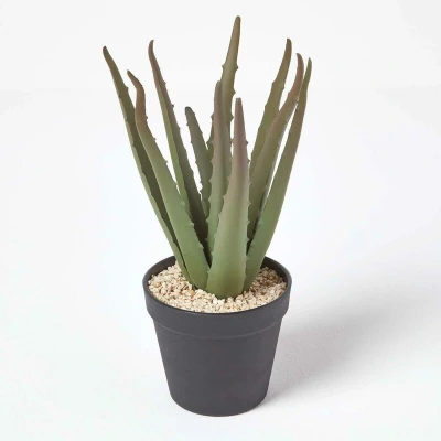 General description This 30 cm tall potted artificial Aloe Vera plant in a black plastic pot with faux gravel adds a contemporary touch to any home or office. Part of Homescapes' extensive collection of artificial succulents and cacti, this handcrafted plant is designed to resemble the iconic aloe plant, offering a botanically accurate appearance that mimics real plants. Technical specifications Brand: Homescapes Plant Height: H 30 x W 17 cm Pot Dimensions: H 11 cm x W 12 cm Pot base: 8 cm Colour: Green Material: Plant - plastic and foam; Pot - plastic Usage Designed for indoor decoration Can be placed in a colorful vase to match your interior style Recommended to keep out of direct sunlight Dust regularly with a dry cloth for maintenance