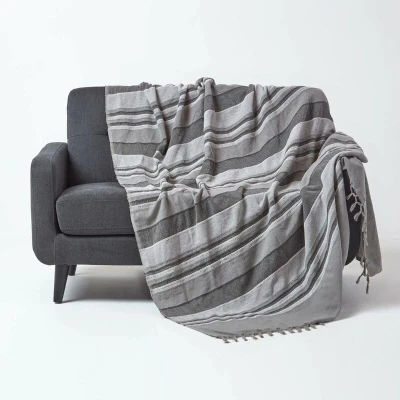 HOMESCAPES Light Grey Throw “Morocco Cotton Textured Stripe 225 x 255 cm Bedspread Sofa Handmade Suitable for 2 or 3 Seater Sofas Double and King Size Beds Machine Washable