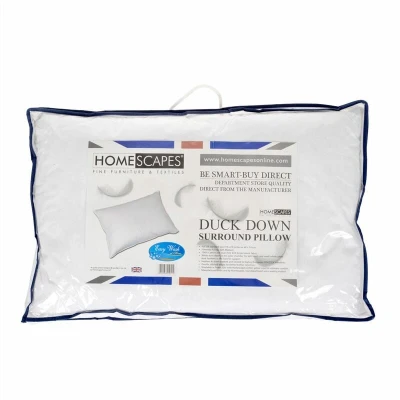 ManoManoGeneral description The HOMESCAPES White Duck Down Surround Pillow features a smart design that combines a supportive duck feather core with a soft down outer layer, providing a luxurious sleeping experience. This pillow is ideal for both front and back sleepers, offering gentle support and cloud-like comfort. Technical specifications Brand: Homescapes Size Available: 48cm x 74cm (19" x 29") Cover Material: 100% cotton Filling: Top section duck down filled, core section duck feather filled Firmness: Soft-Medium Pack Includes: One pillow Care Instructions: Machine washable Other information