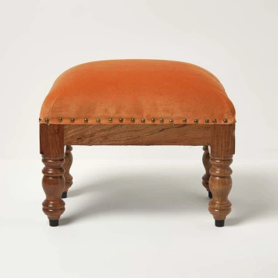 Rectangular velvet footstool on solid wooden legs. Measures: Measuring W 50 x D 30 x H 40 cm. Material: Cotton Velvet Fabric, Polyurethane Padding, and Wooden frame. Colour: Burnt Orange. A classic style soft and durable velvet footstool upholstered with decorative stud edging. Sitting on a solid wooden base and 4 sturdy legs this multifunctional footstool can be used as a footrest, additional seat or occasional table. Finished to the highest standard and upholstered by skilled craftspeople, each footstool is expertly handmade and is designed for daily use. Spot clean only. A colourful addition to your home that will complement traditional and modern styles, the Mable velvet footstool is part of an exclusive velvet homeware collection, co-ordinating bean pouffes, dining chair seat pads, throws and cushions available. A British brand, Homescapes are known for their top quality, soft furnishings, duvets, pillows and bed linen and uncompromising service since 2000., Manufacturer: Homescapes