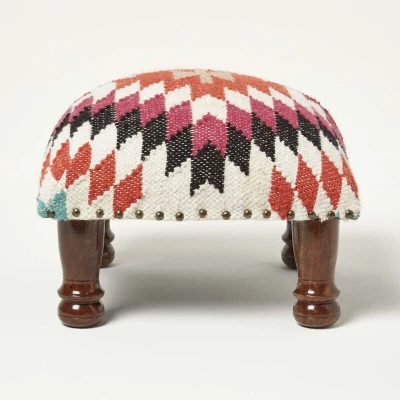 HOMESCAPES Manila Kilim Footstool Traditional Handmade Orange & Pink on Wooden Legs Square 40 x 25 cm Handwoven Wool Cotton Pouffe with Indian Geometric Design