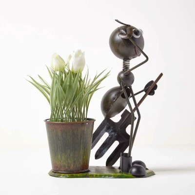 ManoManoGeneral description This charming metal ant garden ornament from Homescapes adds a playful touch to your outdoor space. Standing at 32 cm tall, it features a whimsical design with a spring neck, slender arms and legs, and a large body and head. The ant carries a garden fork and comes with a rustic metal plant pot, perfect for planting small flowers or herbs. Technical specifications Brand: Homescapes Size: L25 x W17 x H32 cm Colour: Black and green Material: 100% Metal Iron Other information Powder coated to prevent rusting Hand painted for a unique look Fixed onto a sturdy metal base with a grassy effect for stability Ideal for placement beside ponds, patios, or balconies Part of a larger range of garden accessories from Homescapes