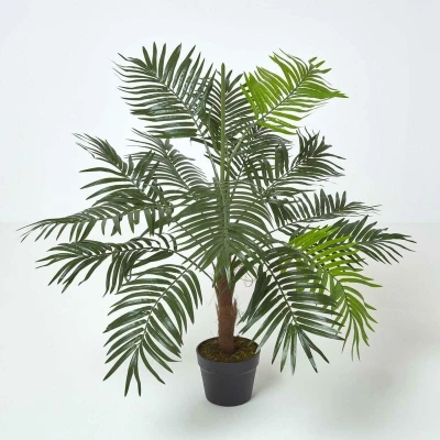 General description Just the thing to counter drizzly British weather, this Green 3 ft Mini Palm Tree Artificial Plant will give your home a tropical taste. Perfect for those who love the look of lush greenery but don’t have the time, space, or gardening know-how to care for living houseplants, this replica palm provides a low-maintenance way to introduce natural color into your home. With two husk-covered trunks, this fern-like plant showcases large, leafy fronds in varying green shades, all made from realistic-looking, durable synthetic materials, so you don’t have to worry about wilting or discoloring in even cold offices or warm conservatories. It comes supplied in an imitation moss-covered plant pot, which can be placed into a decorative container to suit your décor. Thanks to a UV resistant coating, this plant can be used anywhere in your home without fear of sun-bleaching, but it is recommended that it is not placed outdoors. Technical specifications Brand: Homescapes Plant