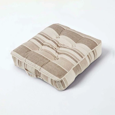 ManoManoBrand Homescapes Size Available 40cm x 40cm x 8cm (16″ x 16″ x 3″) Size Colour Beige Cover Material 100% cotton Care Instructions Spot clean only Pack Includes One floor cushion Morocco Striped Floor Cushions are from a range of soft furnishings made for quick and affordable makeover in a home. Made up of 100% cotton fabric and filled with high quality resilient fibres the Morocco Striped Cotton floor cushion in Beige looks lovely in any room. This floor cushion coordinates well with other soft furnishings such as the throws, scatter cushions and curtains in same designs. These floor cushions comes with a carry handle and are easy to carry anywhere indoors as well as outdoors. These can be used as chair pads, seat pads, dining booster cushions, children floor cushions and garden bench cushions. We have a vast collection of floor cushions in plain, thick and thin stripes, beautiful floral and retro prints and classic woven tartan checks.