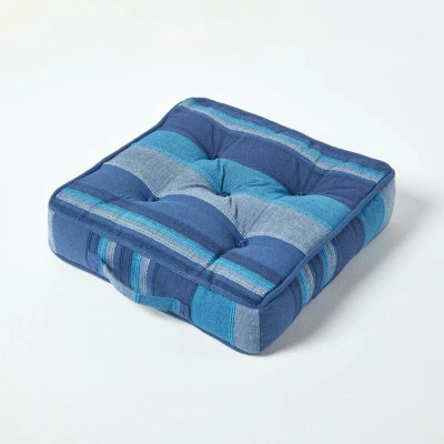 HOMESCAPES Morocco Striped 100% Cotton Floor Cushion Blue 40 x 8 cm Square Indoor Garden Dining Chair Booster Seat Pad