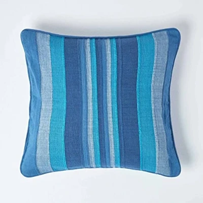 Brand Homescapes Size Available 45cm x 45cm (18" x 18") Colour Blue Cover Material 100% cotton Care Instructions Machine washable Pack Includes One cushion cover Colorful striped scatter cushion cover from Homescapes – transform your sofa or bed into a true eye-catcher Would you like to add a splash of colour to your interiors? Then Homescapes has just the right thing for you! All cushion covers from the product range "Morocco" are manufactured by hand on traditional looms in India . The proceeds from the sales go directly to the weavers and their families, enabling a significant improvement of their living conditions. To complement the cushion covers, Homescapes also offers eyelet curtain pairs, bedspreads and sofa throws and floor cushions in 9 beautiful colours ( blue, beige, terracotta, yellow, green, pink, purple, grey and black and white (monochrome) ). So, you can decorate your bedroom or living room according to your preference and liking. This Homescapes range of cotton soft