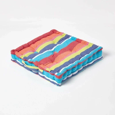ManoManoGeneral description The HOMESCAPES Cotton Multicoloured Stripe Floor Cushion is a versatile and stylish addition to any home. Made from 100% cotton fabric and filled with high-quality resilient fibers, this cushion is designed for comfort and durability. Its vibrant multicolored stripes make it a perfect accent piece for various settings, whether indoors or outdoors. Technical specifications Brand: Homescapes Size: 50cm x 50cm x 10cm (20" x 20" x 4") Cover Material: 100% cotton Care Instructions: Spot clean only Pack Includes: One floor cushion Usage This floor cushion is multifunctional and can be used in various ways: As chair pads As seat pads As dining booster cushions As children's floor cushions As garden bench cushions Other information