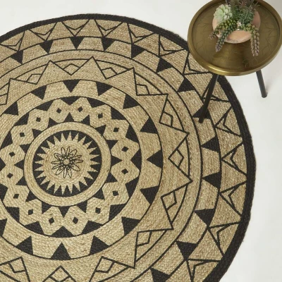 HOMESCAPES Natural & Black Mandala Braided Jute Rug, 150 cm Round