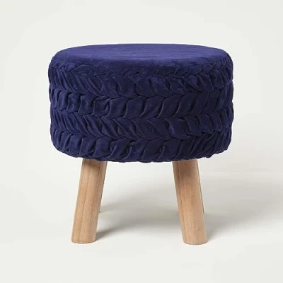 Lyla. Round pleated velvet footstool on solid wooden legs. Measures: 40 cm tall x 41 cm wide. Material: Cotton & Wood. Colour: Navy Blue. A modern style velvet footstool, handcrafted and finished with a decorative pleated edge. Sitting on solid wooden legs this multifunctional footstool can be used as a footrest, additional seat or occasional table. Finished to the highest standard and upholstered by skilled craftspeople, each footstool is expertly handcrafted from luxuriously soft and durable 100% cotton velvet and is ideal for daily use. Spot clean only. A colourful addition to your home that will complement traditional and modern styles, the Lyla velvet footstool is part of an exclusive velvet homeware collection, bean pouffes, dining chair seat pads, throws and cushions are also available. A British brand, Homescapes are well respected for their top-quality homeware, furniture, soft furnishings and uncompromising service since the year 2000. Complete the look with our collection of co-ordinating home accessories and décor., Manufacturer: Homescapes