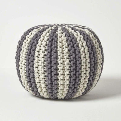 100% cotton knitted pouffe striped footstool. Colour: grey and off white. Measures: 35 x 40 cm Generously filled with polystyrene beads, this lightweight multifunctional rounded footstool can be used as an additional seat, a footrest, a side table and more. A chic take on the hand-knitted trend, these striped pouffes introduce a modern style with a homemade touch. Knitted pouffes are perfect for adding a pop of colour to living areas, conservatories, play rooms and more. Part of Homescapes exclusive collection of knitted pouffes and footstools, available in a range of styles and sizes and a huge range of colours. Co-ordinating knitted storage baskets are also available in 2 sizes for you to complete the look. The perfect place for all your homeware needs, Homescapes were established in the year 2000 and offer an exclusive collection of co-ordinating soft furnishings that will help you to add those finishing touches to transform your home.