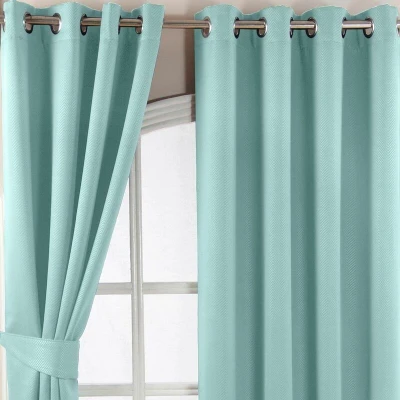 HOMESCAPES Pastel Blue Eyelet Ring Top Blackout Thermal Curtains Pair Width 117cm (46") x 228cm (90") Drop Herringbone Chevron Textured Retro Geometric Design FREE SWATCHES