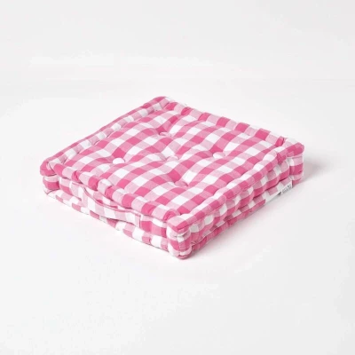 ManoManoGeneral description Made from 100% cotton fabric and filled with high-quality resilient fibers, the HOMESCAPES Pink Block Check Cotton Gingham Floor Cushion is a versatile addition to any room. This cushion features a charming pink block check design and is perfect for various uses, including as chair pads, seat pads, dining booster cushions, children's floor cushions, and garden bench cushions. It comes with a convenient carry handle, making it easy to transport indoors or outdoors. Technical specifications Brand: Homescapes Size: 50cm x 50cm x 10cm (20" x 20" x 4") Cover Material: 100% cotton Care Instructions: Spot clean only Pack Includes: One floor cushion Other information