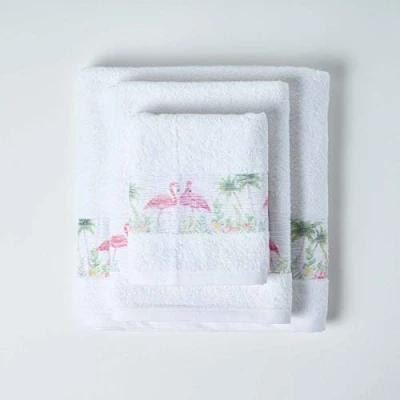 White Turkish cotton towels. Sizes available: hand towel (50 x 90 cm), bath towel (70 x 120 cm) and bath sheet (100 x 140 cm) with a flamingo design. Featuring a unique flamingo design of two flamingos against a jungle scene. Highly absorbent towels with a 420 GSM to leave you feeling dry and comfortable. This decorative towel is white with the pink flamingo design along the bottom. Ideal for your bathroom, guest bathroom or as a flamingo beach towel. Part of Homescapes' wide selection of cotton towels, bathrobes and bathmats. Machine washable at home, wash at 40C. Suitable for tumble drying on a medium heat, avoid the use of fabric softener and ensure item is thoroughly dried before use.