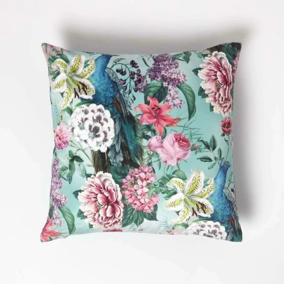 HOMESCAPES Pink & Green Reversible Velvet Floral Cushion 46 x cm Filled Decorative Throw Pillow with Peacock Design Insert Included
