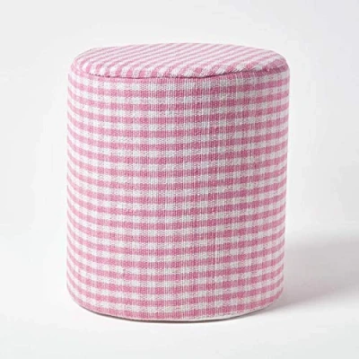 AmazonSturdy pouffe with a strong & compressed polystyrene filling and soft polyurethane padding. Encased in a luxurious cotton (97%) and polyester (3%) cover. Classic gingham cotton fabric in pink Rounded, cylindrical shape Use as a footstool, pouffe or side table Round Shape, Measures 40 x 40 x 42 cm