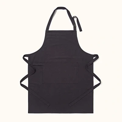 AmazonBlack apron in thick cotton Ideal for BBQs, baking, hobbies and more Measures 85cm x 80cm (33" x 31") Long waist tie (85cm/33") Large, practical front pocket