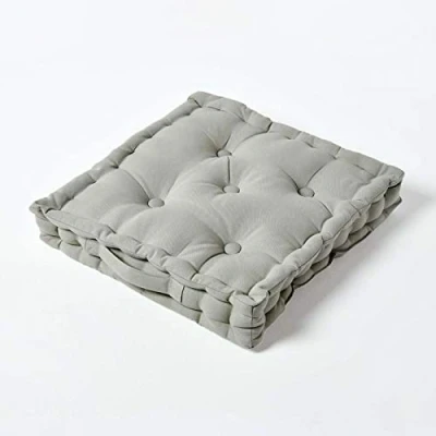 HANDCRAFTED COTTON: Plain floor booster cushion with cover woven from pure 100% cotton. Super soft and naturally breathable. Featuring a hand quilted design and an easy carry handle. Colour: grey, light silver. Measures 40 x 40 x 8cm. THICK & PLUSH SUPPORT: Relax with specialist super microfibre for the perfect support. Highly resilient fibres to ensure these floor seat pads remain thick and firm over multiple uses. Spot clean only. CERTIFIED SKIN FRIENDLY: Hypoallergenic seat cushions. Oeko Tex Standard 100 Certified, planet friendly with no harmful chemicals. Suitable for sensitive skin and pets. VERSATILE USAGE: Ideal use for both indoors or outdoors as floor cushions, seat pads, booster cushions for the elderly, dining chair cushions or garden cushions for picnics. Perfect for playing board games with loved ones. BRITISH EXPERTISE: With more than 24 years of expertise, Homescapes offers uniquely affordable luxury and is a leading manufacturer of home decor in the UK and Europe. Our luxury products are crafted for a sustainable lifestyle. Discover our exclusive collection of home and garden accessories, the range includes matching seat cushions, bench seat pads, garden floor cushions and garden rugs.