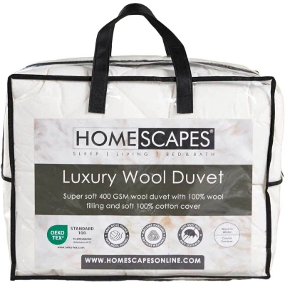 WARM & COSY: Super soft wool duvet with 400gsm Australian wool filling. Heavyweight 100% cotton 233 TC, ideal for colder months during autumn and winter. Fill level of 10.5-13.5 tog. King size duvet, measuring 220 x 230cm. HEALTHY SLEEP: Experience no night sweats. Our wool duvets are naturally breathable, temperature regulating and moisture wicking - keeping you dry and comfortable all night. YOUR PERFECT TEMPERATURE: Encounter no cold spots with our classic diamond quilting. Our wool duvets have ties to attach additional duvets if required, allowing you to customise your preferred warmth and weight. Suitable for all seasons, keeping you warm in winter and cool in summer. CERTIFIED SKIN FRIENDLY, KIND MERINO WOOL: Hypoallergenic and Oeko-Tex Certified, our wool duvets contain no harmful chemicals. We use ethically sourced, clean and odourless Woolmark-certified wool for our wool bedding. MACHINE WASHABLE: Our wool duvets are washable at 30°C on a delicate cycle. Hang to dry and ensure the wool duvet is thoroughly dry before using. Do not tumble dry. BRITISH EXPERTISE: With more than 24 years of expertise, Homescapes has offered uniquely affordable luxury and is a leading manufacturer of luxury bedding and home decor in the UK and Europe. Our premium products are crafted for a sustainable lifestyle. Discover our exclusive collection of top-quality bedding including feather pillows, duvets, fitted sheets and covers.