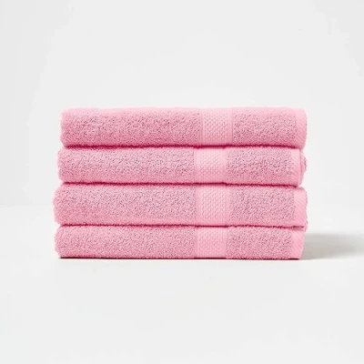 Set of 4 Bath Towels Size: 70 x 130 cm. Colour: Pink. A quality towel for everyday use in a heavy 500 GSM weight from Homescapes in 23 different colours. Six sizes are available in each colour. 100% finely combed cotton fibres ring spun and woven in Turkey. Towels from Turkey are known for the luxury they bring to every bathing experience. Retains its softness after wash due to higher quality of cotton fibre used in manufacturing. Washable at 40°C. For the best care of your towel, Homescapes recommends not to use fabric conditioner/softener whilst washing, and not to iron your towels as both reduce absorbency.