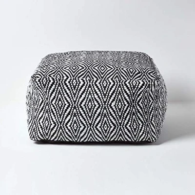 General description Relax and put your feet up on the Trance pouffe from Homescapes. Featuring a monochromatic diamond pattern, this pouffe adds fun and style to your home interiors. Handcrafted by skilled artisans in India, it serves as a sturdy room accessory, perfect for use in your bedroom as a spare seat or for resting your feet. Technical specifications Brand: Homescapes Size: 60 x 60 x 30 cm Colour: Black & white Cover Material: 60% Cotton, 40% Polyester Filling: 100% Polyester Type: Cube pouffe Care Instructions Spot cleaning with a damp cloth Do not soak Usage This durable foot stool is generously filled with polystyrene beads, providing a supportive and comfortable seat or footrest, suitable for daily use.
