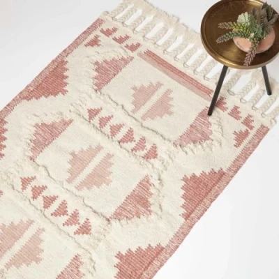 ManoManoGeneral Description Pink and white handcrafted kilim rug with a tribal Aztec style geometric design and tufted detail. A colourful area rug for bedrooms, living spaces and hallways. Handwoven from a blend of premium cotton and wool, this pastel pink boho rug is perfect for all rooms in the home. Expertly hand-dyed in pink and white hues to create a stylish two-toned rug that brightens any part of the home. Finished with ivory frayed tassels, this tapestry rug is decorative and durable, perfect for heavy footfall areas. Choose from four different sizes to suit your space: 66 x 200cm, 90 x 150cm, 120 x 170cm and 160 x 230cm. A hand-loomed kilim rug that has been tightly woven into a geometric pattern to create a long-lasting and durable rug that can complement various decor styles. Perfect for adding a colourful, artistic touch to any room it can be paired with the Homescapes’ range of kilim cushions for a complementary look. Due to the nature of kilim, all handwoven rugs will vary