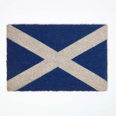 CLASSIC AND STYLISH DESIGN: This natural coir doormat features the blue Scottish Saint Andrew's flag with white St Andrew's cross. Measures 60 x 40cm. NON-SLIP RUBBER BACKING: Crafted from durable coir with a sturdy rubber backing, this doormat provides traction to prevent slips so pets and people stay safe inside and out. PET FRIENDLY: Coir material provides the ideal grip for removing dirt from shoes when entering the home. Ideal for homes with dogs or cats, the mats help trap pet fur, paw dirt, and other allergens at entryways. EASY TO CARE AND MAINTAIN: To care for your doormat, it is recommended that you shake dirt and brush mud off regularly outdoors. A BRITISH COMPANY: With over 24 years of expertise in the UK and Europe, Homescapes is a leading manufacturer of home decor, including rugs and doormats. Choose from a wide selection of high-quality rugs and stylish doormats to enhance and personalize your home or office space.