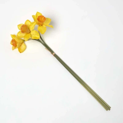 ManoManoGeneral description This lifelike bouquet of artificial daffodils will add a touch of colour and brightness to your interior decoration. This handcrafted fake flower bouquet is remarkably realistic and makes a fantastic Mother's Day gift that will last for years to come. Ideal for a bright ambiance, these artificial daffodils can be used alone in a vase or combined with other stems to create a fuller bouquet. Technical specifications Brand: Homescapes Size: 55 cm Colour: Yellow Material: Polyester, Wire, Plastic Care Instructions Wipe with a soft, slightly damp cloth. Other information The bouquet consists of 3 artificial stems tied with raffia. The stems can be separated for individual use. Vase not included.
