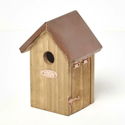 Brand: Homescapes Size: L 11.3 x W 14.2 x H 20.1 cm Colour: Brown Material: 100% FSC Pinewood, Copper Copper-roofed Wren bird box. Built with ethically sourced pinewood and copper, this bird nesting box can be mounted on wall or tree. Fixings not included. Wooden Bird Box A rural and rustic designed bird box, built with a copper roof. Great for conserving the Wren population or reintroducing these small birds into a new area, this insulated box will be perfect for winter use. Boxes should be mounted no higher than 3.5ft, and should be hidden in the shrubbery. Do not place in direct sunlight and ensure the box is at least 32ft away from other wooden bird houses, and 10ft away from feeding houses. Bird Box For upkeep, there is a key hole opening with a hinged door at the side of each bird box. Autumn is the best time to clean the bird house, which can be done with our bird table scraper - sold separately. For other wildlife themed gifts, take a look at our range of garden ornaments and