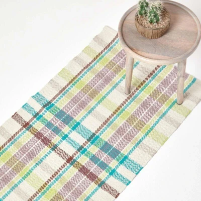HOMESCAPES Tartan Hallway Runner Handwoven Blue, Yellow, Brown & White 100% Cotton Rug 'Wilson' Check Rug, 66 x 200 cm
