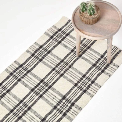 HOMESCAPES Tartan Rug Handwoven White & Black 100% Wool Non Slip Rug, 'Logan' Check Hallway Runner, 66 x 200 cm