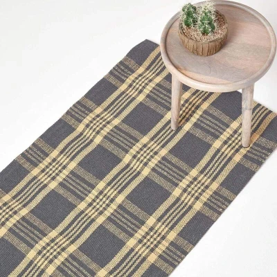HOMESCAPES Tartan Rug Handwoven Yellow & Grey 100% Wool Non Slip Rug, 'Douglas' Check Hallway Runner, 66 x 200 cm
