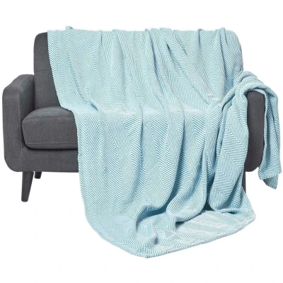 HOMESCAPES Teal Blue Throw 100% Cotton 150 x 200 cm Cosy for Sofa or Bed “Halden Chevron Blanket Herringbone Geometric Pattern Bedspread