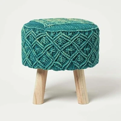 HOMESCAPES Teal Green Macrame Knitted Pouffe On Legs Crochet Round Footstool 100% Cotton Braided Design 43 cm Tall