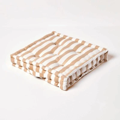 HOMESCAPES Thick Stripe Beige 100% Cotton Floor Cushion Mink Natural 40 x 8 cm Square Indoor Garden Dining Chair Booster Seat Pad