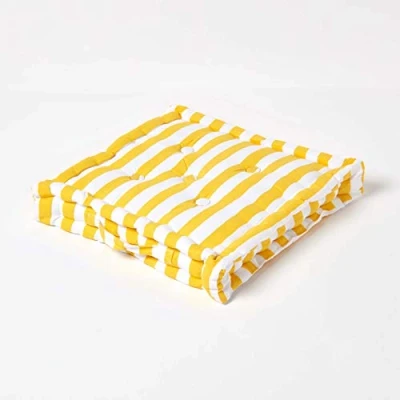 ManoManoGeneral description HOMESCAPES Cotton Yellow Thick Stripe Floor Cushion is a versatile and stylish addition to your home decor. Made from 100% cotton fabric and filled with high-quality resilient fibers, this cushion is designed for comfort and durability. It coordinates well with other soft furnishings, making it a perfect choice for any room. Technical specifications Brand: Homescapes Size: 40cm x 40cm x 8cm (16" x 16" x 3") Color: Yellow Cover Material: 100% cotton Care Instructions: Spot clean only Pack Includes: One floor cushion Usage These floor cushions are very handy and can be used in various ways, including: Chair pads Seat pads Dining booster cushions Children's floor cushions Garden bench cushions Other information