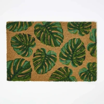 FUN SEASONAL DESIGN: This tropical coir doormat features green Monstera Deliciosa leaves. Measures 60 x 40cm. NON-SLIP RUBBER BACKING: Crafted from durable coir with a sturdy rubber backing, this doormat provides traction to prevent slips so pets and people stay safe inside and out. PET FRIENDLY: Coir material provides the ideal grip for removing dirt from shoes when entering the home. Ideal for homes with dogs or cats, the mats help trap pet fur, paw dirt, and other allergens at entryways. EASY TO CARE AND MAINTAIN: To care for your doormat, it is recommended that you shake dirt and brush mud off regularly outdoors. A BRITISH COMPANY: With over 24 years of expertise in the UK and Europe, Homescapes is a leading manufacturer of home decor, including rugs and doormats. Choose from a wide selection of high-quality rugs and stylish doormats to enhance and personalize your home or office space.
