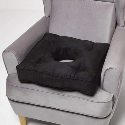 PRESSURE CUSHION: Expertly handmade for superior quality and durability. Portable and lightweight, our carefully engineered ring cushion is the perfect coccyx pain relief cushion. Size: 50 x 50 cm square x 10 cm Deep (20″ x 20″ x 4″) Colour: Black. LASTING SUPPORT: A generous 10cm thick, our firm donut cushion retains its shape for long-lasting support. This specialist coccyx cushion for tailbone pain distributes weight and pressure evenly - and is recommended by doctors for pain relief. PREMIUM MATERIALS: Densely filled with our specialist polyfibre - perfect for relieving your back, hips, and knees. Ideal for the elderly, this sciatica pain relief cushion is also perfect for pregnancy, post-operation, or as a hemorrhoid cushion. STYLISH DESIGN: In luxurious faux suede, with a charming piped edge, and discreet carry handle, in stylish colours. This donut pillow revives sofas and armchairs effortlessly, and matches any decor, whether at home, in the office, or in your car. SPECIALIST RANGE: The much-loved original Homescapes booster cushion range has been perfected over decades, offering stylish designs, colours and fabrics. Discover our dining, armchair and travel booster cushions so you can be comfortable everywhere., Manufacturer: Homescapes