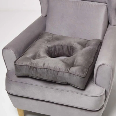 PRESSURE CUSHION: Expertly handmade for superior quality and durability. Portable and lightweight, our carefully engineered ring cushion is the perfect coccyx pain relief cushion. Size: 50 x 50 cm square x 10 cm Deep (20″ x 20″ x 4″) Colour: Grey. LASTING SUPPORT: A generous 10cm thick, our firm donut cushion retains its shape for long-lasting support. This specialist coccyx cushion for tailbone pain distributes weight and pressure evenly - and is recommended by doctors for pain relief. PREMIUM MATERIALS: Densely filled with our specialist polyfibre - perfect for relieving your back, hips, and knees. Ideal for the elderly, this sciatica pain relief cushion is also perfect for pregnancy, post-operation, or as a hemorrhoid cushion. STYLISH DESIGN: In luxurious faux suede, with a charming piped edge, and discreet carry handle, in stylish colours. This donut pillow revives sofas and armchairs effortlessly, and matches any decor, whether at home, in the office, or in your car. SPECIALIST RANGE: The much-loved original Homescapes booster cushion range has been perfected over decades, offering stylish designs, colours and fabrics. Discover our dining, armchair and travel booster cushions so you can be comfortable everywhere., Manufacturer: Homescapes