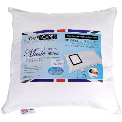 General description This cloud-like Super Microfibre pillow features a stylish square shape and a built-in quality music speaker, making it perfect for music lovers, tinnitus sufferers, and anyone who enjoys drifting off to sleep with background noise. Technical specifications Brand: Homescapes Size: 65cm x 65cm (26" x 26") Cover Material: 100% microfibre Filling: 100% super microfibre Firmness: Soft Pack Includes: One pillow Compatibility and accessories Compatible with most music players via a 3.5mm jack socket Works with phones, MP3 players, and tablets Care Instructions Machine washable Speakers can be removed for washing Hypoallergenic filling helps kill dust mites