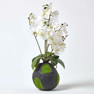 Carefully handcrafted by skilled experts, Homescapes' artificial plants look just as good as real flowers and plants. Easy to maintain, simple wipe away dust or dirt with a soft cloth and keep out of direct sunlight. Homescapes are a leading manufacturer of artificial plants, trees and flowers for the home and office. Choose from a wide selection of flowers and plants available in a range of colours, styles and sizes to add floral decoration to your home. White medium artificial orchid from Homescapes oriental Phalaenopsis orchid in full bloom with lifelike leaves and natural black and green moss style circular base. 60cm tall. Introducing a stylish look into your home, this elegant white orchid has a natural base allowing you to display it as it is or to choose a display pot, it is ideal for living room, entrance hall and bedroom side table decoration. Created from a special silk-like polyester, the petals look and feel real and lifelike. This material has been treated with UV protection to prevent colour fading over time. With natural base.
