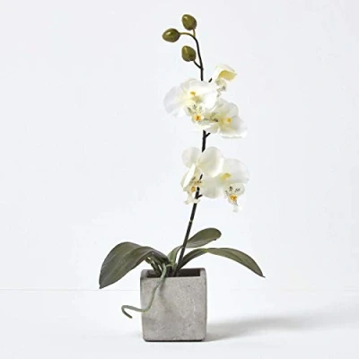 AmazonLovely evergreen white orchid in square grey stone pot - approx. 40 cm tall. Pot 8 x 8 x 8 cm Each pot contains one stem with approx. 5 flowers, 3 leaves and a faux soil finish. Pot made of grey concrete. Also available with cerise flowers. For indoor and outdoor use. This timeless orchid arrangement makes a perfect gift or all-season decoration. It looks great on window benches and in alcoves and is ideal for darker spots, where real flowers would wither quickly. High quality, real looking replica plant to be used for all-season home or office decoration. No watering or maintenance needed! Simply remove dust with a damp cloth. Eco-friendly, versatile and re-usable which make it a great alternative to real plants or flowers. Homescapes offers a wide range of artificial plants and flowers complimenting its high quality hard wood furniture. All flowers and plants are perfect for bringing instant life and a stunning new look to your interiors!