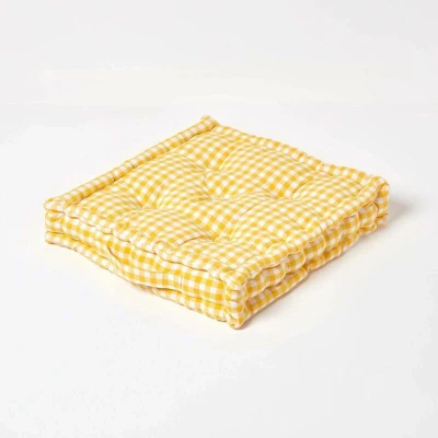 ManoManoGeneral description The HOMESCAPES Cotton Gingham Check Yellow Floor Cushion is a stylish and versatile addition to any home. Made from 100% cotton fabric and filled with high-quality resilient fibers, this cushion is perfect for enhancing the comfort of your living space. Its cheerful yellow gingham check pattern adds a touch of charm, making it suitable for various rooms. Technical specifications Brand: Homescapes Size: 50cm x 50cm x 10cm (20" x 20" x 4") Cover Material: 100% cotton Care Instructions: Spot clean only Pack Includes: One floor cushion Usage This floor cushion is highly versatile and can be used in various ways: As chair pads As seat pads As dining booster cushions As children's floor cushions As garden bench cushions Other information