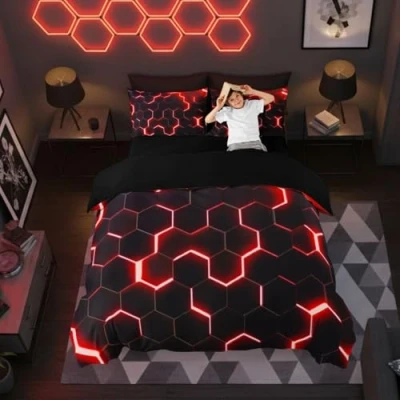 Homewish Honeycomb Bedding Set King,Red Black Geometric Duvet Cover Neon Glitter Hexagon Geometry Comforter For Kids Boys Teen Men Soft Lightweight Quilt Bedroom Dorm Decor