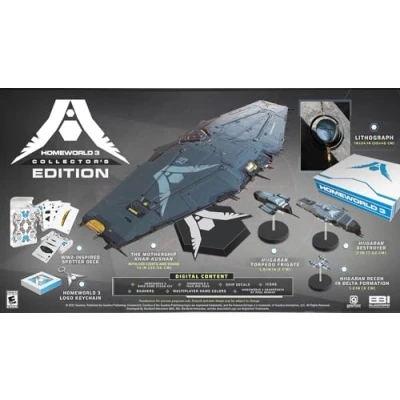The Mothership, Khar-Kushan - This lovingly crafted 14” (35.6cm) model features USB-powered LEDs illuminating the ship's engines, ports, and launch bays. Details include a removable bay door capable of displaying the Destroyer and authentic sounds from the game. The Mothership comes equipped with a dual positioned stand to accommodate both vertical and horizontal display options to best fit your set up. Hiigaran Destroyer - An all-purpose capital ship your enemies always dread seeing measuring 3in (7.62cm). Hiigaran Torpedo Frigate - Brimming with imposing launchers, the Torpedo Frigate is a devastating threat to enemy capital ships. Measures 1.8in (4.5cm) Hiigaran Recon in delta formation - The eyes and ears of Fleet Command and the fastest ships in the Hiigaran fleet, measuring 1.2in (3cm) WW2-inspired spotter deck - Ship recognition playing cards featuring the fleets of Homeworld 3 and perhaps a surprise or two., Platforms: Windows, ESRB Rating: Everyone 10+