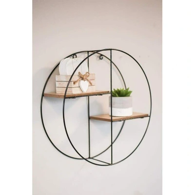 HomeZone Modern Wooden Round Shaped 2 Tier Floating Shelves Wall Mounted Black Metal Shelf, Industrial Display Rack Hanging Shelf for Office, Kitchen, Bathroom, Bedroom, Living Room Decor