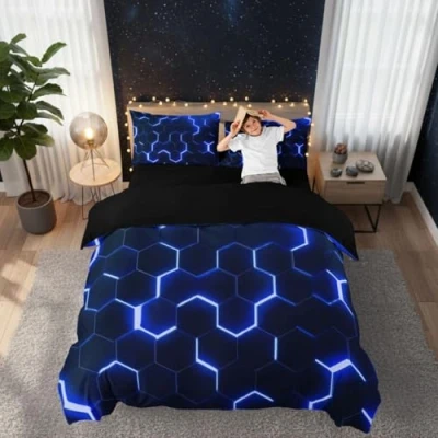 Honeycomb Comforter Cover Neon Light Geometric Bedding Set King For Kids Boys Teens,Geometry Hexagonal Duvet Soft Microfiber Quilt Zipper 2 Pillow Cases Blue Black Room Decor