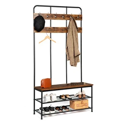 Spacious & Sturdy Solution: Struggling with limited space for shoes and coats? Our extra-large coat and shoe rack, measuring 100 x 35.5 x 182 cm, is the perfect answer! It provides ample room for all your belongings, ensuring your home stays organized and clutter-free Thoughtful Design: Featuring 12 coat hooks that can each hold up to 5kg, this unit is perfect for busy households. The shoe rack offers a comfortable place for changing shoes, with a top bench that supports up to 100kg and two additional layers below to neatly store shoes out of the way. Works great for a family! Modern Hallway Storage Unit: Elevate your entryway with our stylish storage solution that combines functionality with a modern aesthetic. Its eye-catching design and industrial charm make it a standout piece that enhances your hallway while providing essential storage Always in Protection: 4 adjustable feet keep the storage shelf organizer balanced on uneven ground, ensure remarkable stability, and prevent scratches on the floor Easy to Assemble: No need to worry about your DIY skills! Our hall tree is designed for effortless assembly, allowing you to set it up in no time. Enjoy the satisfaction of creating your own stylish entryway—get started today!